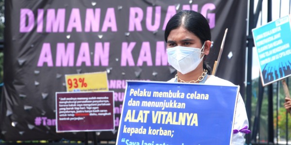 Telusur.co.id - Sejumlah aktivis Perempuan dari Lembaga Bantuan Hukum Jakarta, melakukan aksi damai di depan pintu