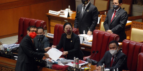 Telusur.co.id - Menteri Hukum dan Ham Yasonna Laoly (kiri) menyampaikan keputusan pemerintah kepada Ketua DPR Puan Maharani
