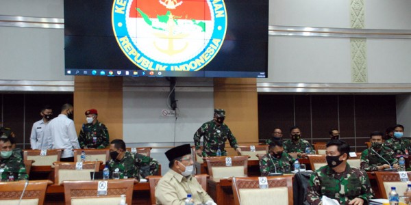 Telusur.co.id - Menhan Prabowo Subianto dan Panglima TNI Marsekal Hadi Tjahjanto dan KSAD Jend TNI Andika Perkasa