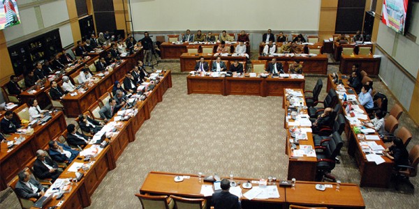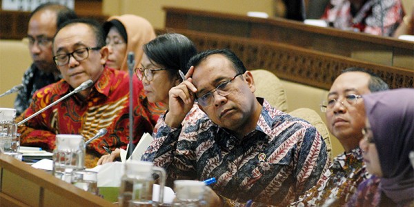 Telusur.co.id - Menteri Sekretaris Negara, Partikno (tengah) serius mendengarkan pertanyaan-pertanyaan Anggota Dewan saat Rapat kerja (raker)