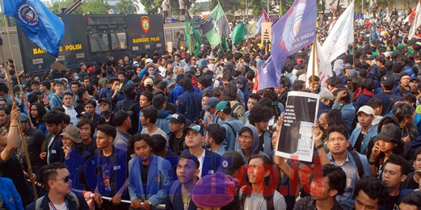 Telusur.co.id - Aksi Unjuk rasa yang dilakukan ribuan mahasiswa didepan pintu gerbang gedung DPR RI dari