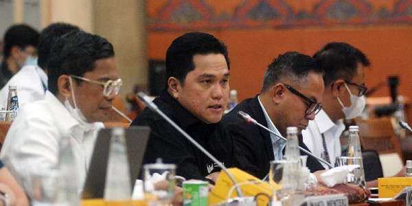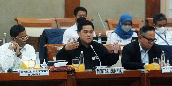 Telusur.co.id Menteri BUMN RI Erick Thohir (tengah) didamping Wakil Menteri Pahala Nugraha Mansury (kiri) dan Kartika