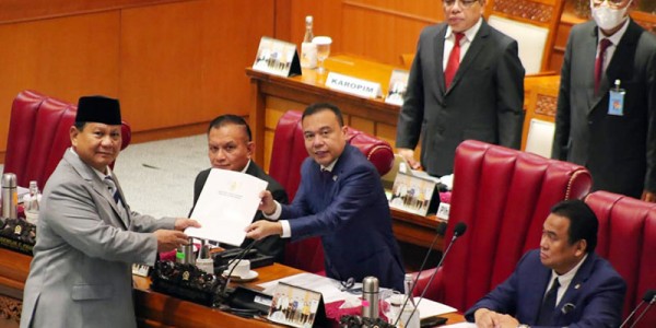 Telusur.co.id -Menteri Pertahanan Prabowo (depan) menyampaikan dokumen laporan pemerintah terkait RUU pengesahan perjanjian pertahanan kepada Wakil