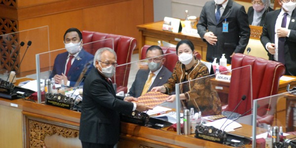 Telusur.co.id -Menteri Pekerjaan Umum dan Perumahan Rakyat (PUPR) Basuki Hadimuljono (kiri depan) menyerahkan naskah pandangan Pemerintah