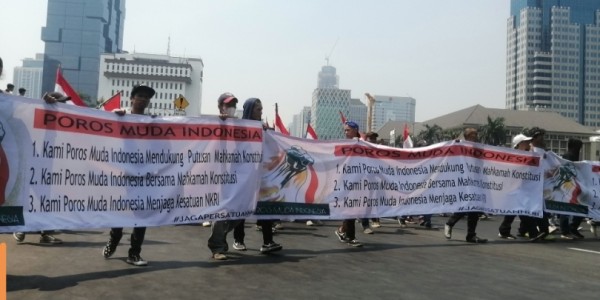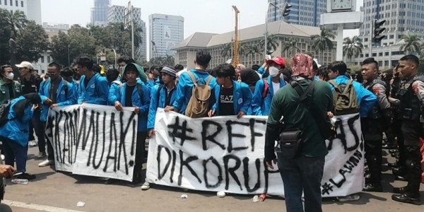 Telusur.co.id - Unjuk rasa di Patung Kuda Arjuna Wiwaha, Jakarta Pusat, Senin (16/10/23) terus berdatangan menjelang