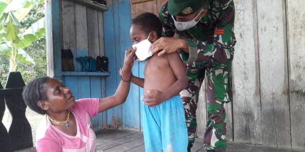 Telusur.co.id - Guna mencegah penyebaran pandemi Virus Corona atau Covid-19, prajurit Satgas Yonif 754/ENK/20/3 Kostrad membagikan