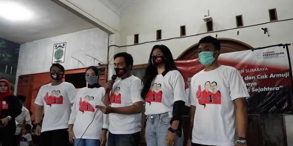 Telusur.co.id - Ratusan kaum milenial lintas organisasi yang tergabung dalam Aliansi Kebangsaan Kota Surabaya berkumpul memberi