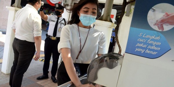 Telusur.co.id - Pegawai PT Bank Tabungan Negara (Persero) Tbk. mencuci tangan di wastafel yang disiapkan oleh Bank