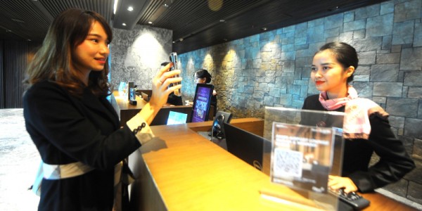 Telusur.co.id -Seorang nasabah BTN Prioritas mengakses layanan QR Code di Saphire Plaza Premium Lounge di Terminal
