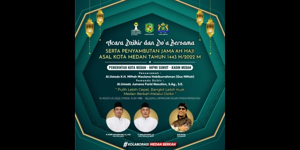 Kegiatan Dzikir dan Doa Bersama serta penyambutan jamaah haji bertema 'Pulih Lebih Cepat, Bangkit Lebih Kuat, Medan Berkah Melalui Dzikir' itu bakal digelar di Lapangan Gajah Mada Krakatau, pada tanggal 16 Agustus Pukul 15.00 WIB - selesai.