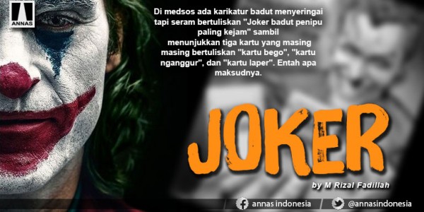 Di medsos ada karikatur badut menyeringai tapi seram bertuliskan "Joker badut penipu paling kejam" sambil menunjukkan tiga kartu yang masing masing bertuliskan "kartu bego", "kartu nganggur", dan "kartu laper". Entah apa maksudnya.