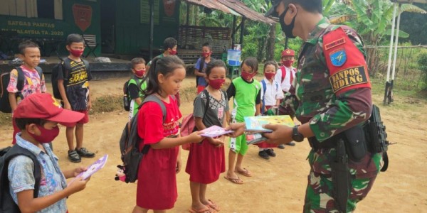 Setelah memberikan bendera, anggota Satgas kemudian pergi ke SDN 1 Siding untuk membagikan perlengkapan sekolah berupa buku dan alat tulis. Selain untuk mendukung kegiatan belajar mengajar, hal ini juga berguna untuk meningkatkan motivasi anak-anak dalam menuntut ilmu sebagai generasi muda penerus bangsa. (Pen Satgas Yonif 642).