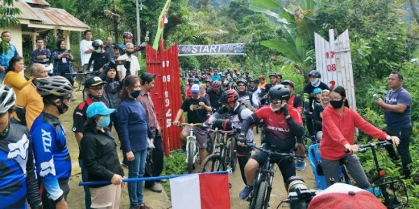 telusur.co.id - Ratusan penikmat sepeda yang bergabung dalam kegiatan olahraga rekreasional di bawah bendera 'GOSAPAT' (Gowes Santai Parapat) berhasil menaklukan rute puncak bukit Bangundolok lintas Kota Parapat sampai ke Puncak Dolok Sigualon, Nagori (Desa) Sibaganding, Kecamatan Girsang Sioangan Bolon (Girsip), Kabupaten Simalungun, Sumut, Minggu (6/9/2020).