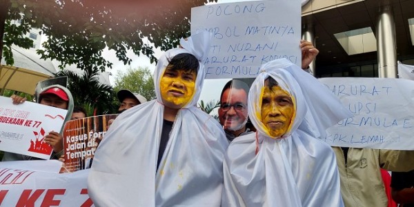 Telusur.co.id - Kelompok massa yang tergabung dalam Satgas Pemburu Koruptor menggelar aksi teatrikal dengan memunculkan sosok