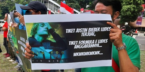Telusur.co.id - Kelompok massa yang tergabung dalam Gerakan Satu Padu (SAPU) Lawan Koruptor Formula E menggelar