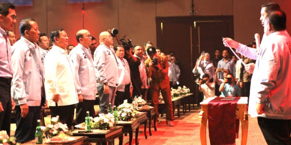 Telusur.co.id -Capres Nomor Urut 2 Prabowo Subianto didampingi Ketua TKN Rosan Roeslani saat menyaksikan pembacaan deklarasi