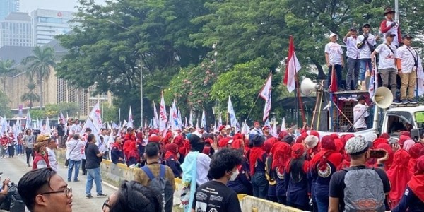 Telusur.co.id - Ribuan buruh yang tergabung dari berbagai aliansi menggelar aksi demontrasi di kawasan Patung Kuda,
