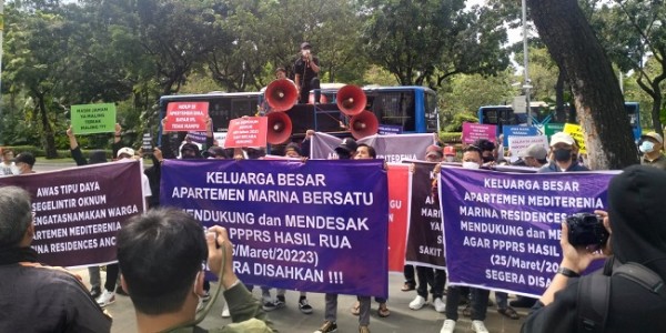 Telusur.co.id - Sejumlah massa yang tergabung dalam Keluarga Besar Apartemen Marina Bersatu (KBAMB) melakukan aksi demontrasi