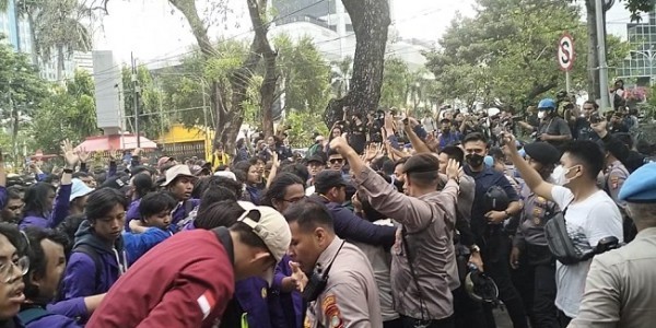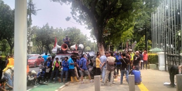 Telusur.co.id - Sejumlah buruh yang tergabung dalam pengguna jasa pelabuhan (Penjaspel) melakukan aksi unjuk rasa di