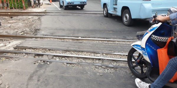 Telusur.co.id - Jalan di pintu kereta Stasiun Karet di Jalan KH Mas Mansyur rusak dan membahayakan