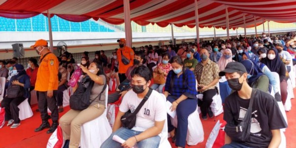 Telusur.co.id - Pemerintah Kota Bekasi menggelar vaksinasi Covid-19 secara massal di Stadion Patriot Candrabhaga, Kota Bekasi,