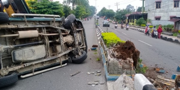 Telusur.co.id - Mobil Kijang LGX BK 1427 NG terbalik akibat menabrak pembatas jalan di Jalan Yos