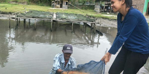Telusur.co.id - Petani tambak ikan mas, Pak Edo Sinaga (55) merawat ikan dalam tambaknya dengan cara melap
