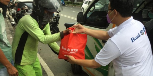 Telusur.co.id -Beberapa pegawai PT Bank Tabungan Negara (Persero) Tbk. membagikan makanan dan hand sanitizer kepada petugas