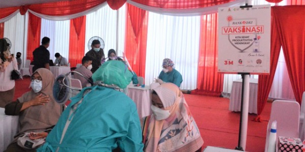 Telusur.co.id -Seorang warga tengah mendapatkan pelayanan vaksinasi Covid-19 di Senta Vaksinasi Bank DKI yang berlokasi di