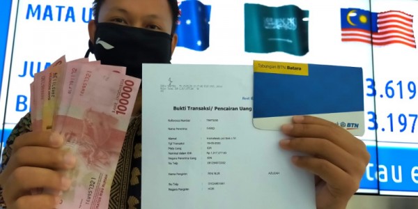 Telusur.co.id - Seorang nasabah menunjukkan bukti penerimaan remitansi atau transfer uang dari pekerja migran Indonesia dari