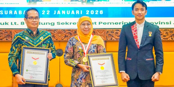 Telusur.co.id - Terima Rekor MURI Penandatanganan Nota Kesepahaman oleh Lembaga Terbanyak Gubernur Jawa Timur, Khofifah Indar Parawansa menandatangani